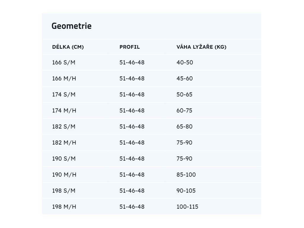 Délka [cm] | Doporučená hmotnost lyžaře [kg] | Profil [mm] |